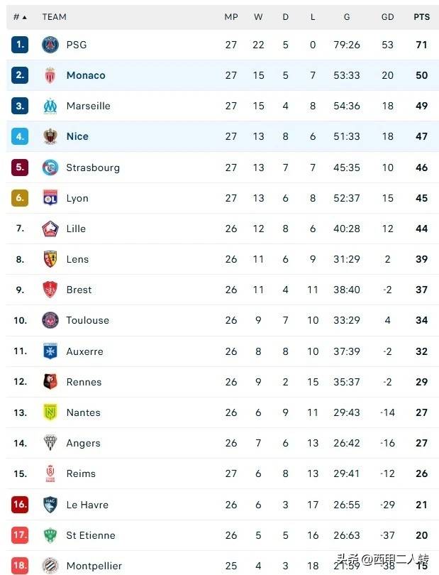 几个小时后,摩纳哥在主场实现逆转,以2-1击败尼斯,凭借这场胜利,摩纳哥以50分升至积分榜第二位。但即便如此,也很难阻挡路易斯·恩里克率领的巴黎圣日耳曼捧起冠军奖杯。